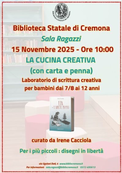 Biblioteca comunale di Cremona Via Ugolani Dati 4, Cremona, ItalyLaboratorio di scrittura creativa collettiva per ragazzi dai 7 ai 12 anni e per i più piccoli...disegni in libertà!